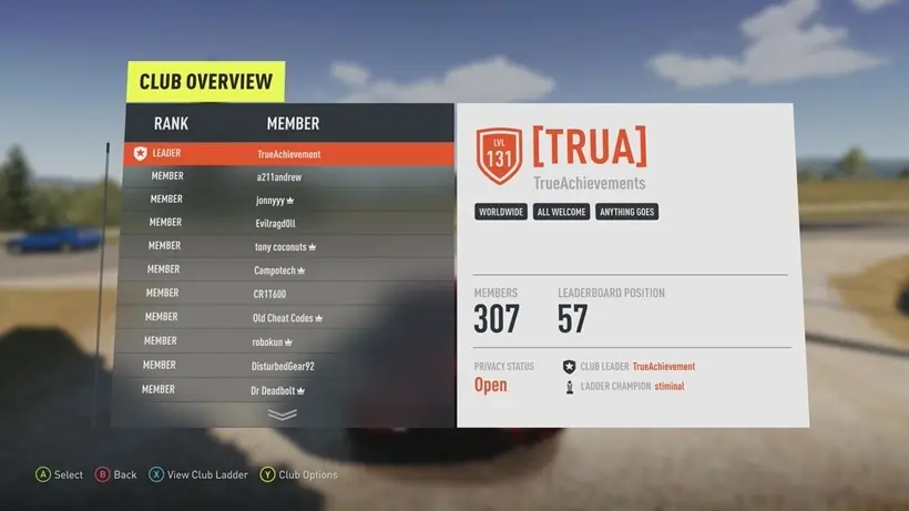 Car Clubs was one of Forza Horizon 2's major social features: players could form clubs, customize their tag and emblem, climb leaderboards, and compete with rival's across the world.